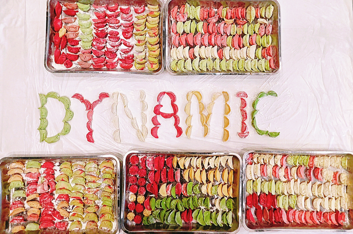 活动现场热闹非凡,员工们分工协作,揉面、擀皮、包馅有条不紊。老手们娴熟的捏出花边饺、元宝饺,新手们大胆尝试渐变纹路饺皮,更有小组合力用彩色饺子拼出公司缩写“DYNAMIC”,创意十足的造型引得大家纷纷拍照打卡。